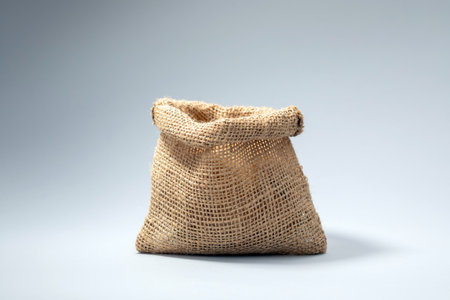 This image features a close-up of a tied jute sack made from natural fibers, showcasing its textured fabric and rustic charm against a bright background.