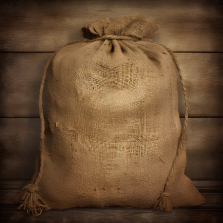 A close-up of a rustic burlap sack tied with twine, showcasing its textured surface and earthy tones, ideal for backgrounds and creative uses.
