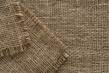 Burlap fabric with torn edges background. Macro texture of coarsely woven sackcloth of hemp, jute or flax. Rustic country style design element. Brown tan colored Ñanvas as craft material. Top view.