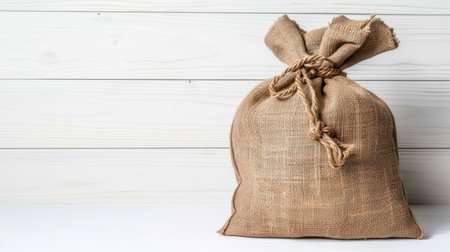 A rustic burlap sack tied neatly, placed on a clean white wooden surface. Ideal for home decor, storage solutions, and crafting projects.