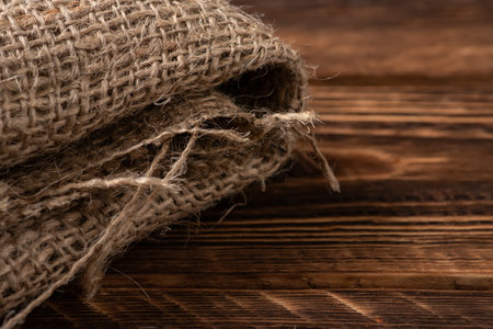 Old wooden table with sack cloth in dark interior with copy space. Burlap texture