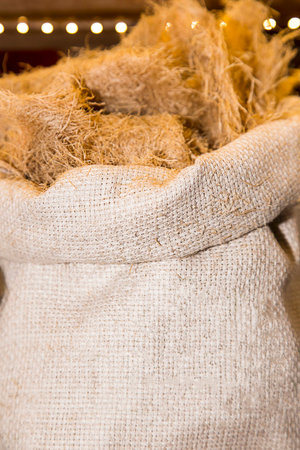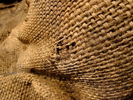 Close-up view of coarse fibers and texture of burlap sack against bright background