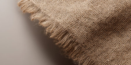 This image features a close-up view of textured burlap fabric with decorative fringes, perfectly capturing its rustic charm and warmth. Ideal for projects.