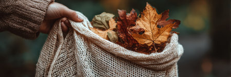 Person gently holds a natural fabric sack filled with vibrant autumn leaves, showing the beauty of fall in a peaceful outdoor atmosphere.