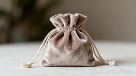 Luxurious small taupe velour bag with creamy twisted strings for jewelry or favors, photographed with shallow depth of field against a soft, blurred light background.