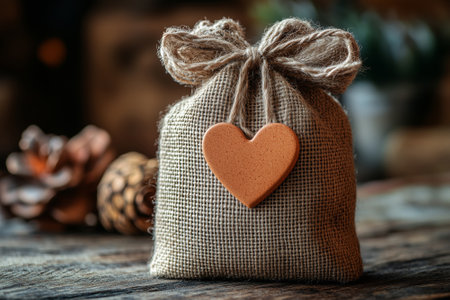 Gift bag with a heart shape on a rustic wooden background.