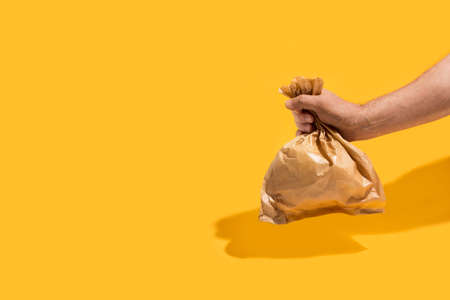 Man holding a paper bag on a yellow background