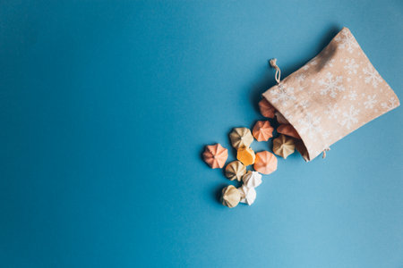 Colorful meringues and a small cloth bag decorated with white snowflakes on a blue background. Selective focus.