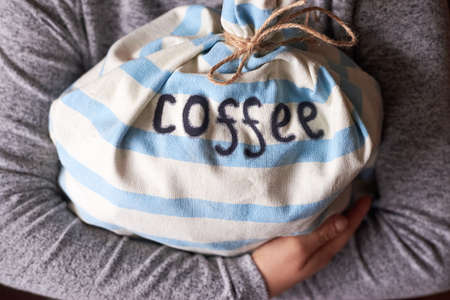 Large bag of coffee in the hands of a woman, close-up.