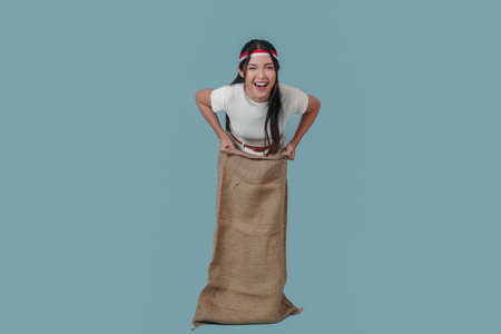Energetic Indonesian woman wearing gunny sack and jumping, joining competition. Indonesia Independence Day concept.
