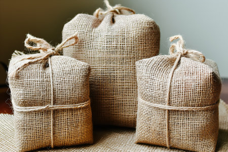 This image features a close-up of a tied jute sack made from natural fibers, showcasing its textured fabric and rustic charm against a bright background.
