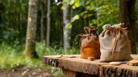 Explore the serene beauty of nature with these fabric bags placed on a rustic wooden table, set against a vibrant forest backdrop, inviting tranquility.