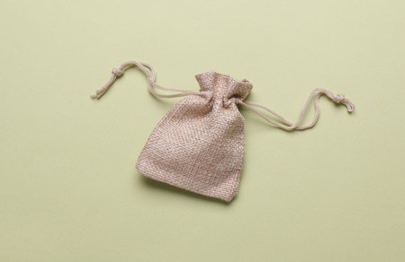 Mini burlap bag on green background
