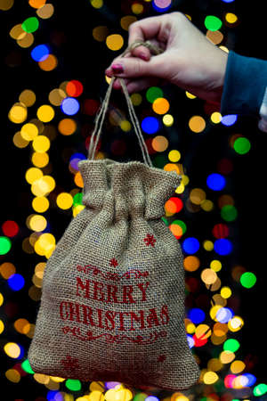 Woman's hands hold christmas decoration. Christmas and New Year holidays background, winter season with Christmas ornaments and blurred lights