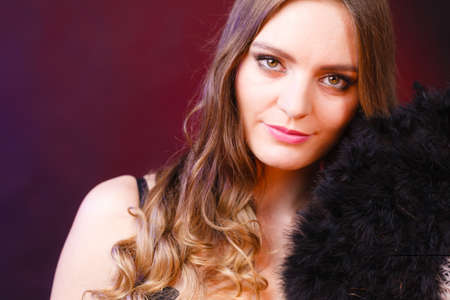 Woman beauty female face eyes makeup holding carnival feather fan in hand. Party new year celebration concept.