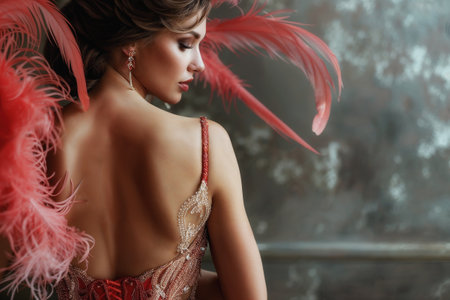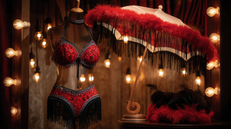A captivating display of a red feathered costume in a vintage cabaret setting, featuring ambient lighting and intricate details that evoke glamour and artistry.