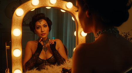 Showgirl adjusting her necklace in a brightly lit makeup mirror backstage, preparing for a performance