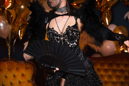 Shiny show girls with crazy black leather and feather outfits with crystals in Eastern Europe Latvia Riga corporate event. holding fan