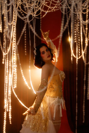 Circus-inspired retro burlesque dancer posing in golden corset with theatrical decor
