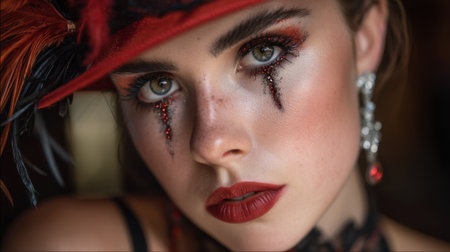 A stunning close-up of a young woman showcasing dramatic makeup with striking eye details. Her expressive look is enhanced by a vibrant hat adorned with feathers, creating an artistic and edgy aesthetic.