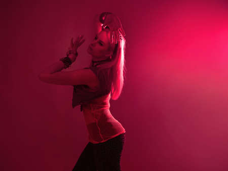 Perfect erotic show showgirl slim woman in night club party dancing in red neon light background. Silhouette of stripper lady in stage costume on dance stage. Party perform concept. Copy ad text space