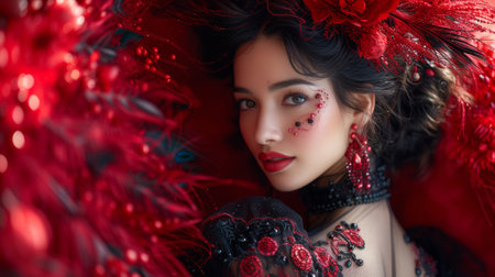 A woman with red makeup and feathers on her face, AI