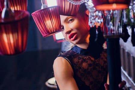 A young beautiful woman in a historical costume of the 20s or 30s of the XX century with a boa and a mouthpiece against the background of lights. High quality photo