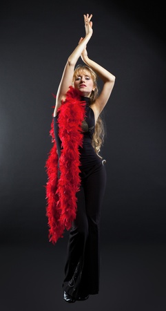 Blond beauty woman dance with red boa