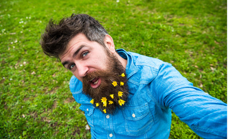 Hipster on cheerful face sits on grass, defocused. Man with beard enjoys spring, green meadow background. Natural beauty concept. Guy with lesser celandine flowers in beard taking selfie photo