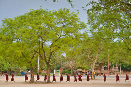 Bagan, Myanmar - April 22, 2016 : Line of Little monks walking