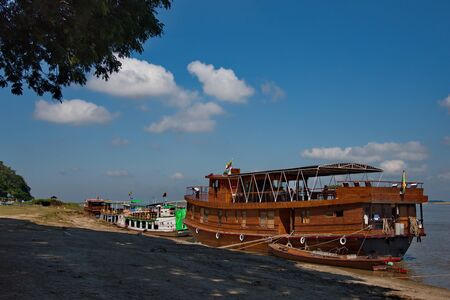 Myanmar. Mingun. 11/21/2016. Cruise river boat Ayarwaddi discovery cruise with tourists on board waiting for departure on an unforgettable journey along the river Ayarwaddi.