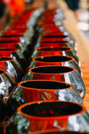 Yangon, Myanmar - March 2019: Buddhist monks during the official ceremony at Shwedagon pagoda. Alms giving ceremony