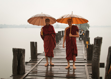 Mandalay, Myanmar - Oct 4, 2011. Buddhist monks walking on Ubein Bridge in Mandalay, Myanmar. The bridge is believed to be the oldest and longest teakwood bridge in the world.