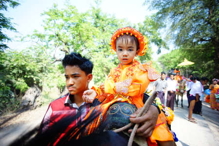 MANDALAY, MYANMAR - FEB 1: Boys ride on the carriage, shaded with gilded umbrellas and accompanied by a procession of family members carrying offerings to a monastery in the novitiation ceremony on Feb 1, 2016 in Mandalay, Myanmar.