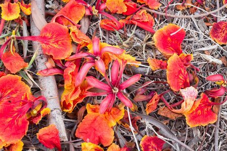 Royal poinciana, flame tree, flamboyant tree. Amazing red and yellow left tree in mexico. high quality photo