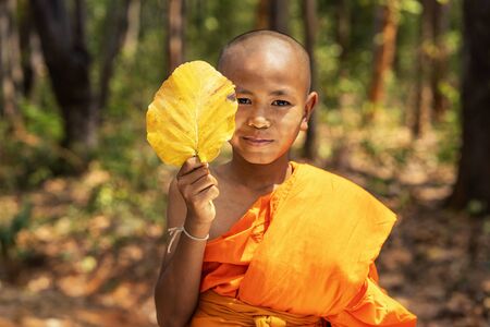 Novices smile are holding the leaves of the tree. Young Buddhist novices in forest in old temple at sunset time. Thailand. Selective focus.