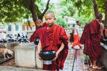 Old Bagan, Myanmar - October 15, 2011: Two unidentified young novice monks walking morning alms in Old Bagan, Myanmar on October 15, 2011.