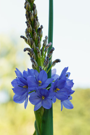 native Australian Morning Iris Orthrosanthus multiflorus plant with blue purple flowers outdoor in beautiful tropical backyard shot at shallow depth of field