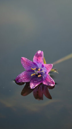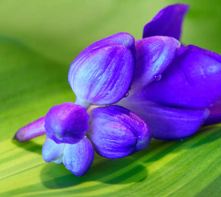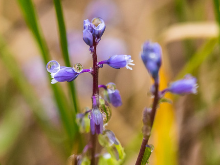 A beautiful purple blue flower on a forest floor after the rain. Shallow depth of field closeup macro photo.