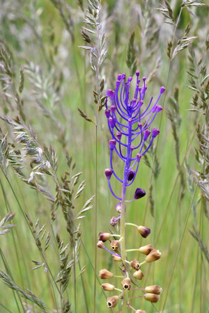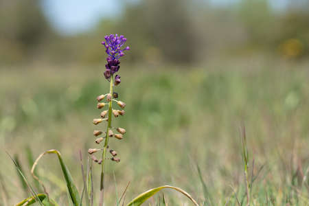 Violet flowers of the tassel hyacinth (Leopoldia comosa or Muscari comosum) in a meadow. Valderejo Natural Park. Basque Country. Spain