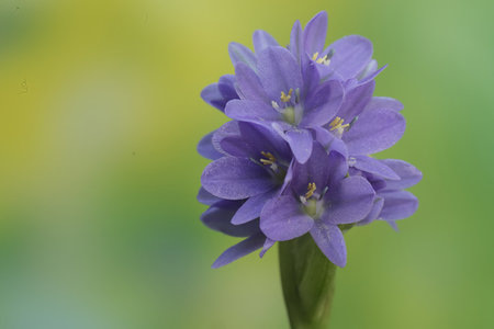 Close-up of the pickerel weed in the rural. Blooming pickerelweed (Pontederia cordata) water plant, violet blue flower. Flower and plant.