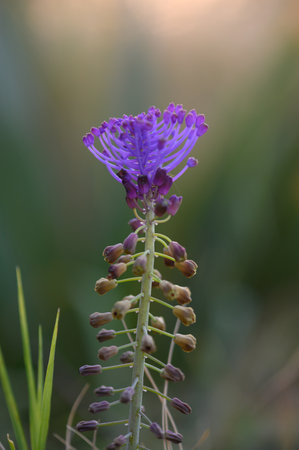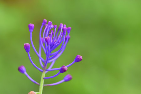 Closeup on a colorful purple blooming Tassel grape hyacinth, Muscari comosum, against a blurred green background