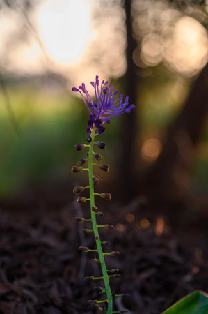 Muscari comosum the tassel grape hyacinth edible plant with intense blue flowers with a large stem flash lighting