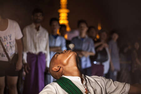 YANGON, MYANMAR DECEMBER 3, 2016 : Street performer in Maha Bandula Park with spinning top performs for crowd at night