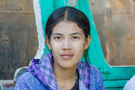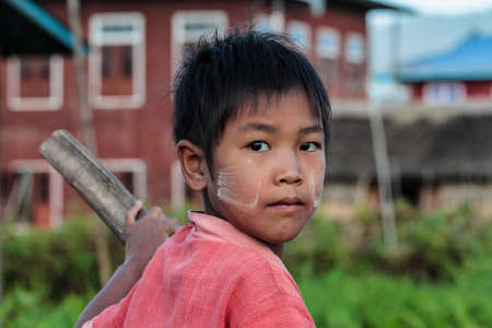 Mawlamyine, Myanmar. November 30, 2016 : A portrait of unidentified young Burmese boy, covered with thanaka paste