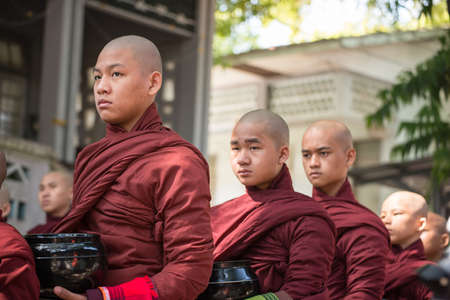 Yangon, Myanmar - Feb 21, 2016. Buddhist nuns walking for morning alms on street in Yangon, Myanmar.