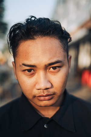 Portrait of a Southeast Asian man wearing a black shirt looking at the camera during golden hour in the afternoon with bokeh background. A vertical photo.