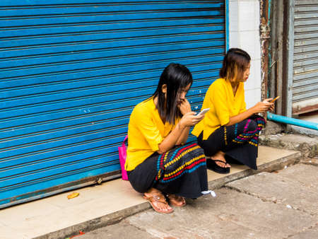 YANGON, MYANMAR - JANUARY 4, 2018: Young girls with their smartphones ignoring each other.