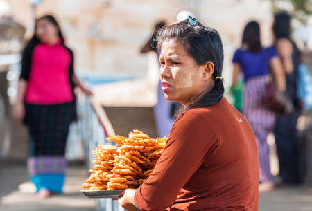 BAGAN, MYANMAR - DECEMBER 1, 2016: A woman selling fried shrimp on a city street