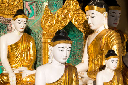 Close up of different sized golden Buddhas at the Shwedagon pagoda in Yangon
